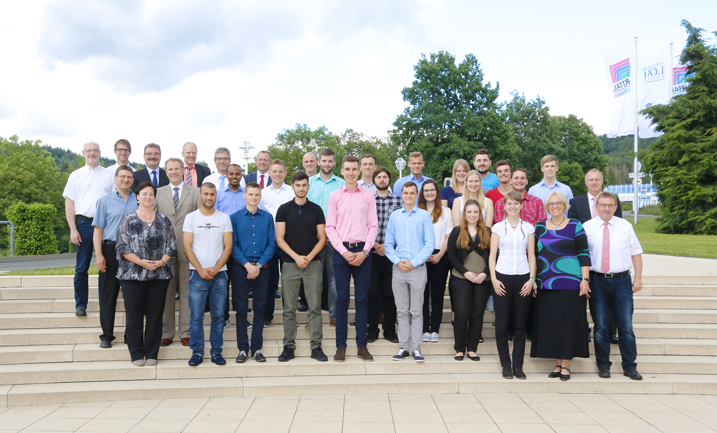 BildmaterialBild 1: 22 Azubis freuten sich mit Jörg Müller (2. Reihe, 2.v.l.), Personalleiter der Friedhelm Loh Group, Matthias Hecker (2. Reihe, r.), Ausbildungsleiter bei Rittal, und Ausbildungskoordinatorin Tina Pfeiffer-Busch (1. Reihe, 2.v.r.), über ihre Zeugnisse.