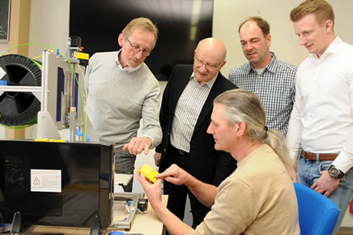BildmaterialBild 1: Mit Hilfe der Rittal Foundation kaufte die THM einen 3D-Drucker – der jetzt auch den Projekten der dualen Studierenden der Friedhelm Loh Group zugute kommt. Stefan Dickel (vorn), wissenschaftlicher Mitarbeiter am Fachbereich Maschinenbau und Elektrotechik, und Professor Dr. Hartmut Bode (l.) zeigten (v.l.) Friedemann Hensgen, Vorsitzender der Rittal Foundation, Rolf Benner und Matthias Kienholz von Rittal das Gerät.