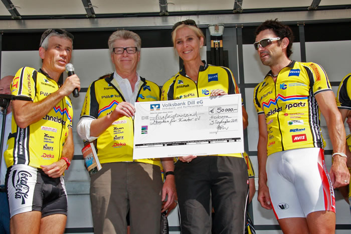 06.09.2011. Da war die Überraschung groß: Ursprünglich hatte Friedhelm Loh den Spendensammlern für ihre Radtour eine Spende von 5.000 Euro angekündigt. Beim Spendenstopp der Benefiz-Radtour des Vereins Menschen für Kinder e.V. überreichte der Inhaber von Rittal jedoch den zehnfachen Betrag. Mit der Spende von 50.000 Euro hilft der Verein krebskranken Kindern.