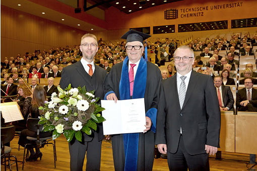 BildmaterialBild: Prof. Dr. Thomas Lampke (l.), Prodekan für Forschung, Internationales und Gleichstellung der Fakultät für Maschinenbau, und Prof. Dr. Andreas Schubert (r.), Kommissarischer Rektor der TU Chemnitz, verliehen Friedhelm Loh vor großem Auditorium feierlich die Ehrendoktorwürde.