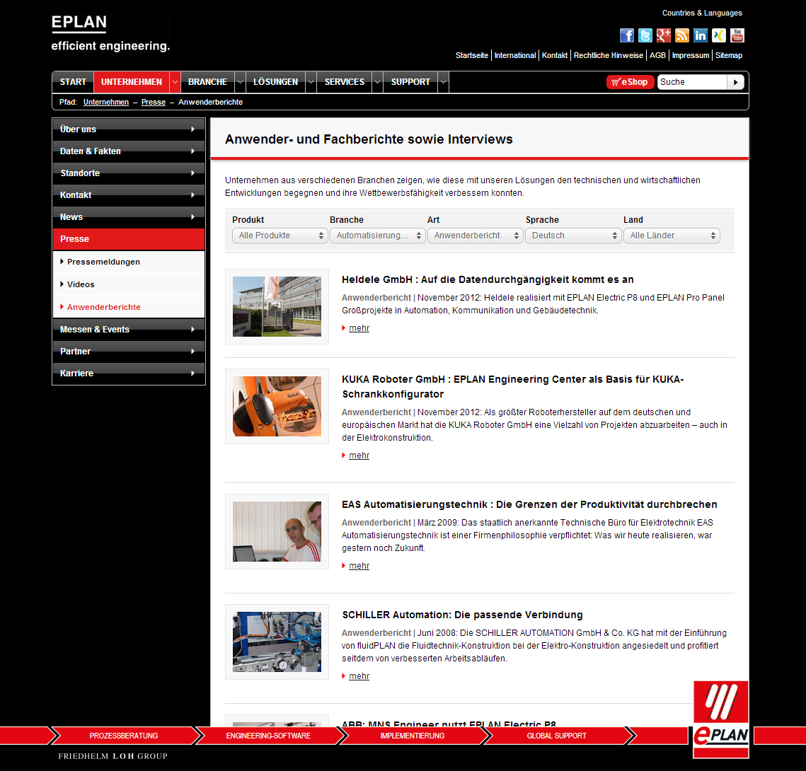 Verringerung von Komplexität – diese Maxime spielt nicht nur im Engineering eine Rolle. In Zeiten von immer mehr Informationen gilt es, Inhalte einfach aufzubereiten und gut strukturiert bereitzustellen. So hat Lösungsanbieter Eplan seine Homepage zum Start des neu-en Jahres komplett überarbeitet. Im einheitlichen Erschei-nungsbild der Friedhelm Loh Group präsentiert sich die Website des Engineering-Anbieters mit zahlreichen zusätzli-chen Inhalten – beispielsweise neuen Branchenseiten. Diese geben unterschiedlichen Kundenkreisen einen gezielten Überblick über das Portfolio an CAx-Lösungen und Dienst-leistungen und werden fortlaufend erweitert. „Mit dem neuen Internet-Auftritt präsentieren wir uns jetzt im einheitlichen Corporate Design der Unternehmensgruppe“, erläutert Haluk Menderes, Geschäftsführer bei Eplan. „Die neue Web-Präsenz macht es unseren Kunden und Interessenten noch einfacher, in wenigen Klicks zu den gewünschten Inhalten zu gelangen. Bis zur Hannover Messe werden auch all´ unsere internationalen Websites im gleichen Design auftreten.“ Über wechselnde Startbilder gelangen Besucher direkt zu den wichtigsten Neuheiten. Neue Filtermöglichkeiten im Bereich Anwenderberichte erlauben Besuchern ein schnelles Finden relevanter Inhalte – bis zur Hannover Messe werden hier auch Praxisberichte aus allen Ländern der Welt zu finden sein.