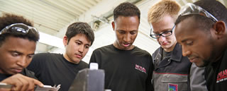 BildmaterialBild 1: Das Azubi-Patenmodell hat sich bewährt: Den Praktikanten sind Auszubildende als Paten zugeteilt. Gemeinsam lernen sie nicht nur Bohren oder Fräsen, sondern erweitern auch ihre Deutsch- und Fußballkenntnisse.