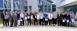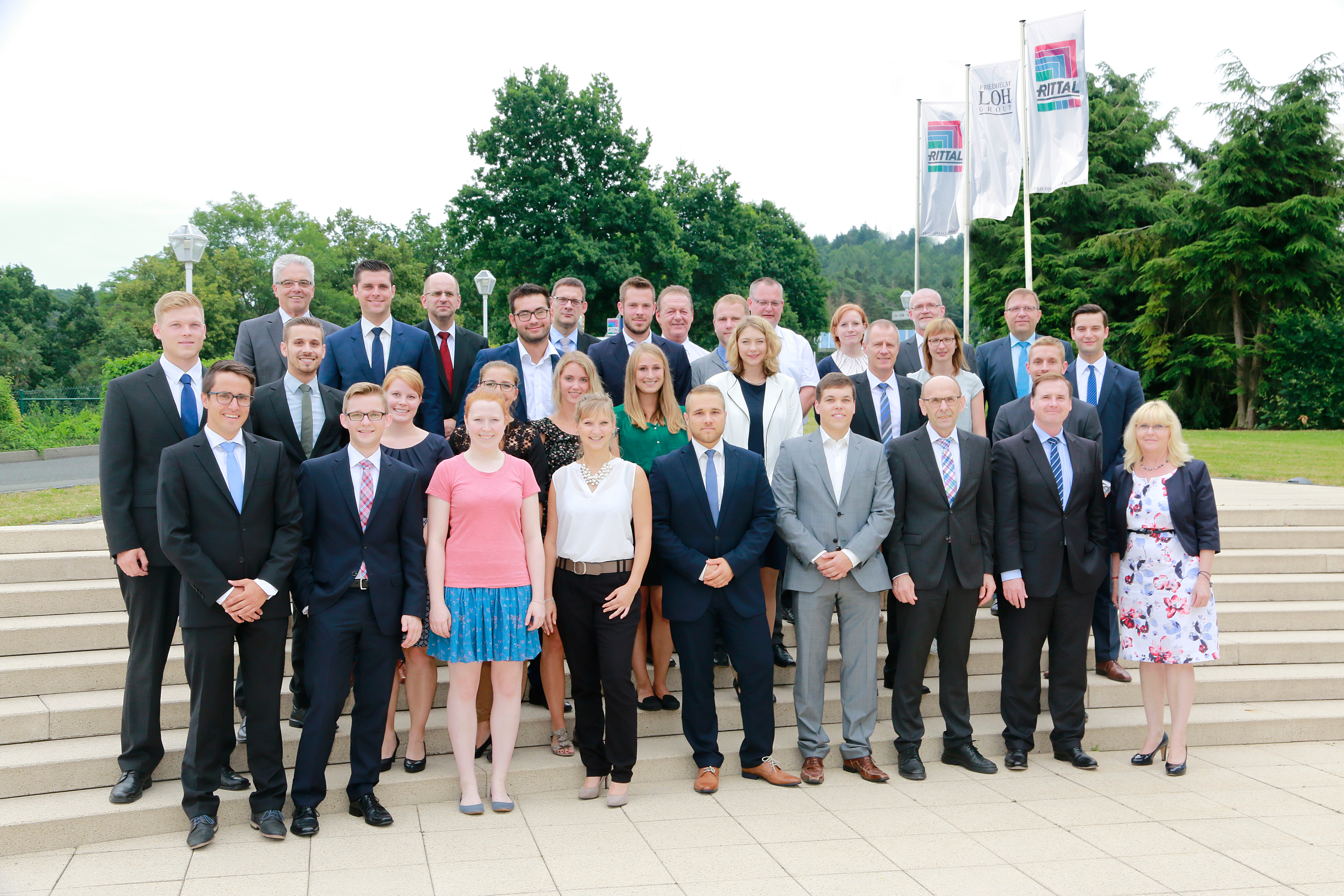 Bild 2: 23 Studierende verabschiedete die Friedhelm Loh Group ins Berufsleben. „Mit ihrem abgeschlossenen Studium haben Sie beste Voraussetzungen. Sie haben viel Wissen erworben und sich das zugehörige Können angeeignet. Nun gilt es, beides im praktischen Tun einzusetzen und auszubauen. Sie haben beste Voraussetzungen für eine erfolgreiche Zukunft!“, lobte Michael Weiher, Geschäftsführer Produktion bei Rittal (1. Reihe, 3. von rechts).