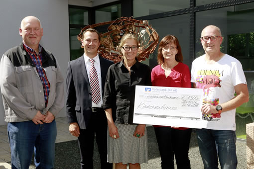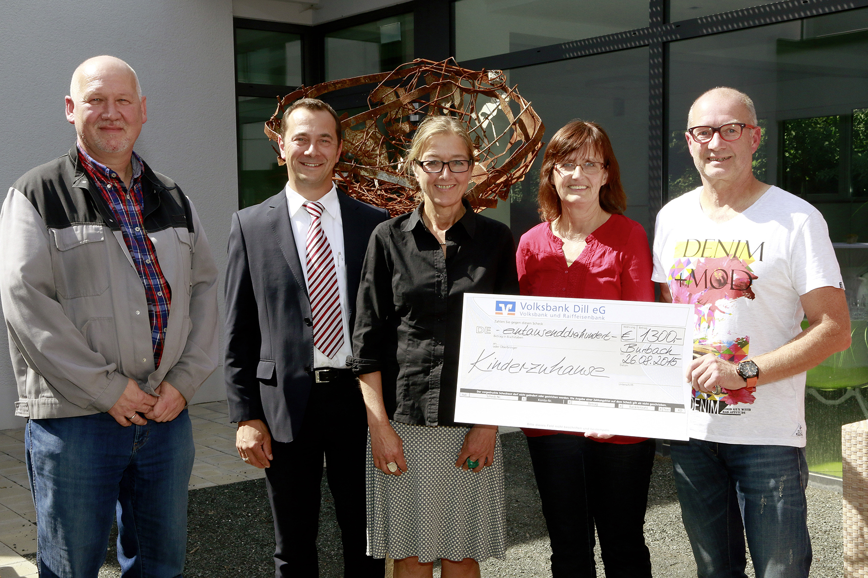 04.09.2015. Seit vielen Jahren unterstützen Burbacher Unternehmen wie Rittal die ortsansässige Pflegeeinrichtung „Kinderzuhause“ für behinderte Mitmenschen. Ende August überreichten der Schaltschrankhersteller und der Arbeitskreis Burbacher Unternehmen dem „Förderverein Kinderzuhause“ einen Scheck über 1.300 Euro.