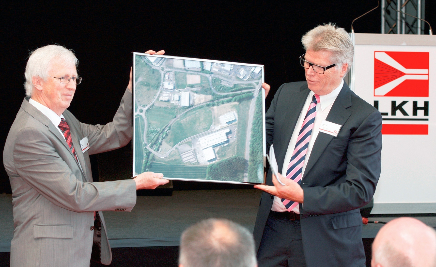 BildmaterialBild 1: Der Heiligenrother Ortsbürgermeister Erich Herbst (l.) überreichte Inhaber Friedhelm Loh eine Luftaufnahme des LKH Betriebsgeländes.