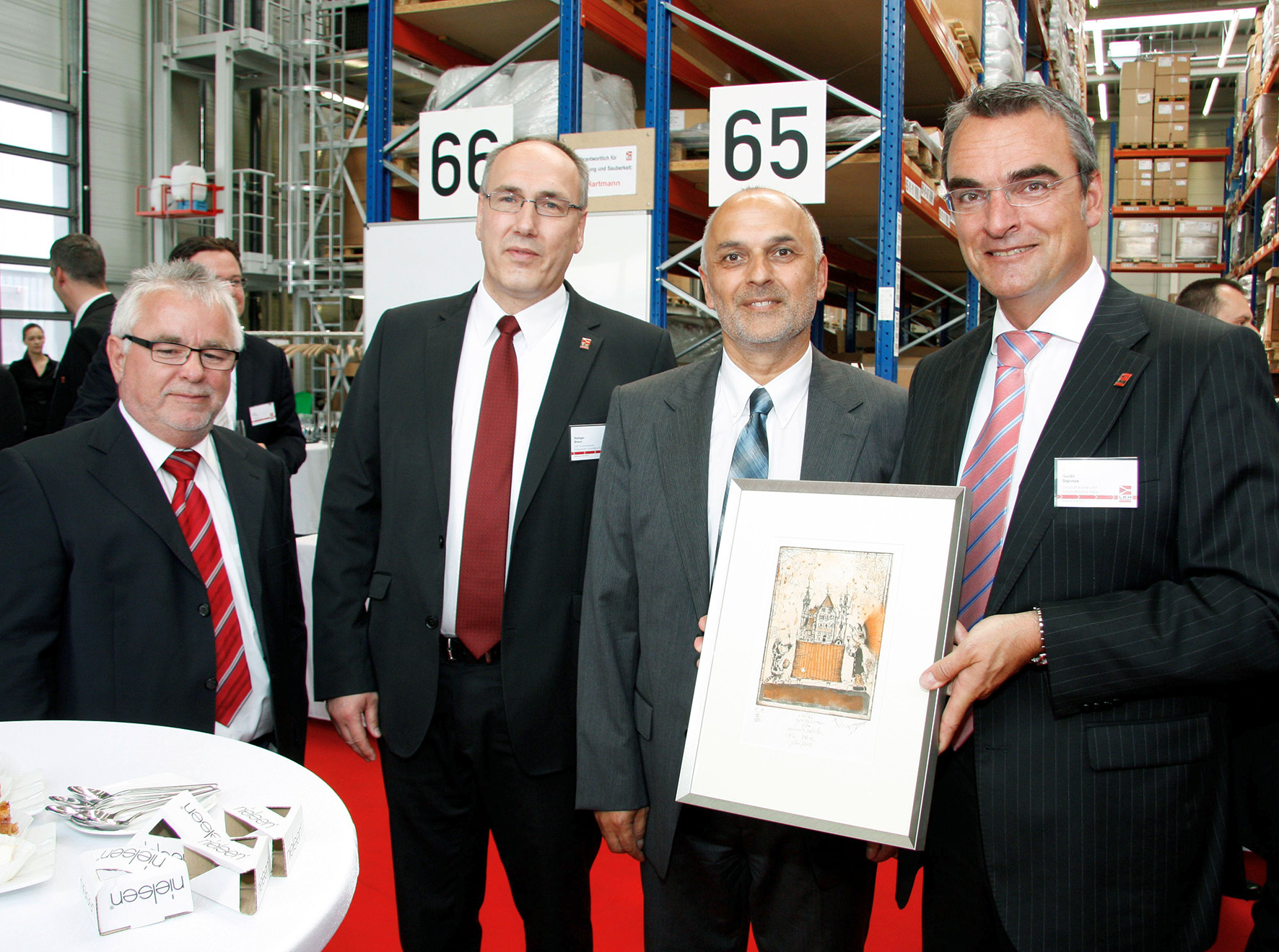 Bild 2: LKH Geschäftsführer Dr. Guido Stannek (r.) und Vertriebsleiter Rüdiger Braun (2. v. l.) freuten sich über das Bild als Einweihungsgeschenk zum neuen Werk, das Norbert Buchlaub (l.) und Herbert Wiebelt von der DBK David + Baader GmbH mitgebracht hatten.