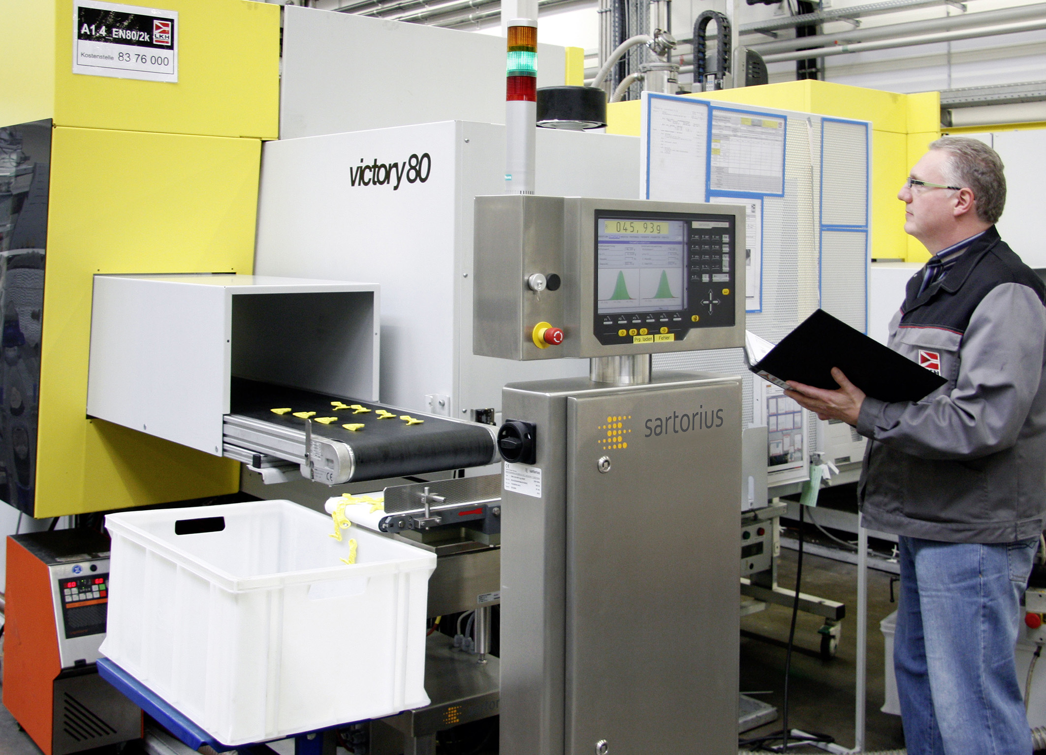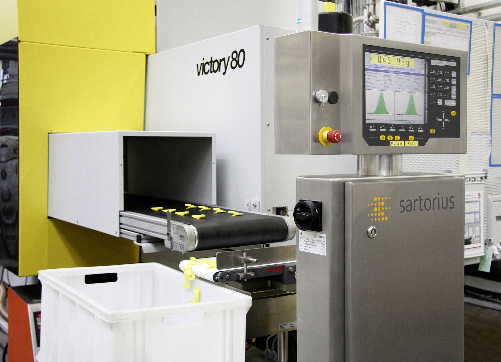 Das Bauteilegewicht dient hier als Indikator für die Prozessqualität: Schwankungen bei Drücken, Temperaturen and anderen Parametern oder auch bei den Werkstoffen wirken sich in schwankenden Füllungsgraden der Kavitäten und damit Werkstückgewichten aus. Während der Einfahrzeit des Werkzeugs bietet diese Technologie eine Möglichkeit, schnell und sicher Teile in Serienqualität zu identifizieren – und damit Umrüstzeiten und Kosten zu senken. Die Waage garantiert mit den frei definierbaren Toleranzgrenzen, dass einerseits nur einwandfreie Bauteile ausgeliefert werden und andererseits, bei mehreren Fehlschüssen in einem definierten Zeitraum, ein Alarm ausgelöst und die Produktion unterbrochen wird.