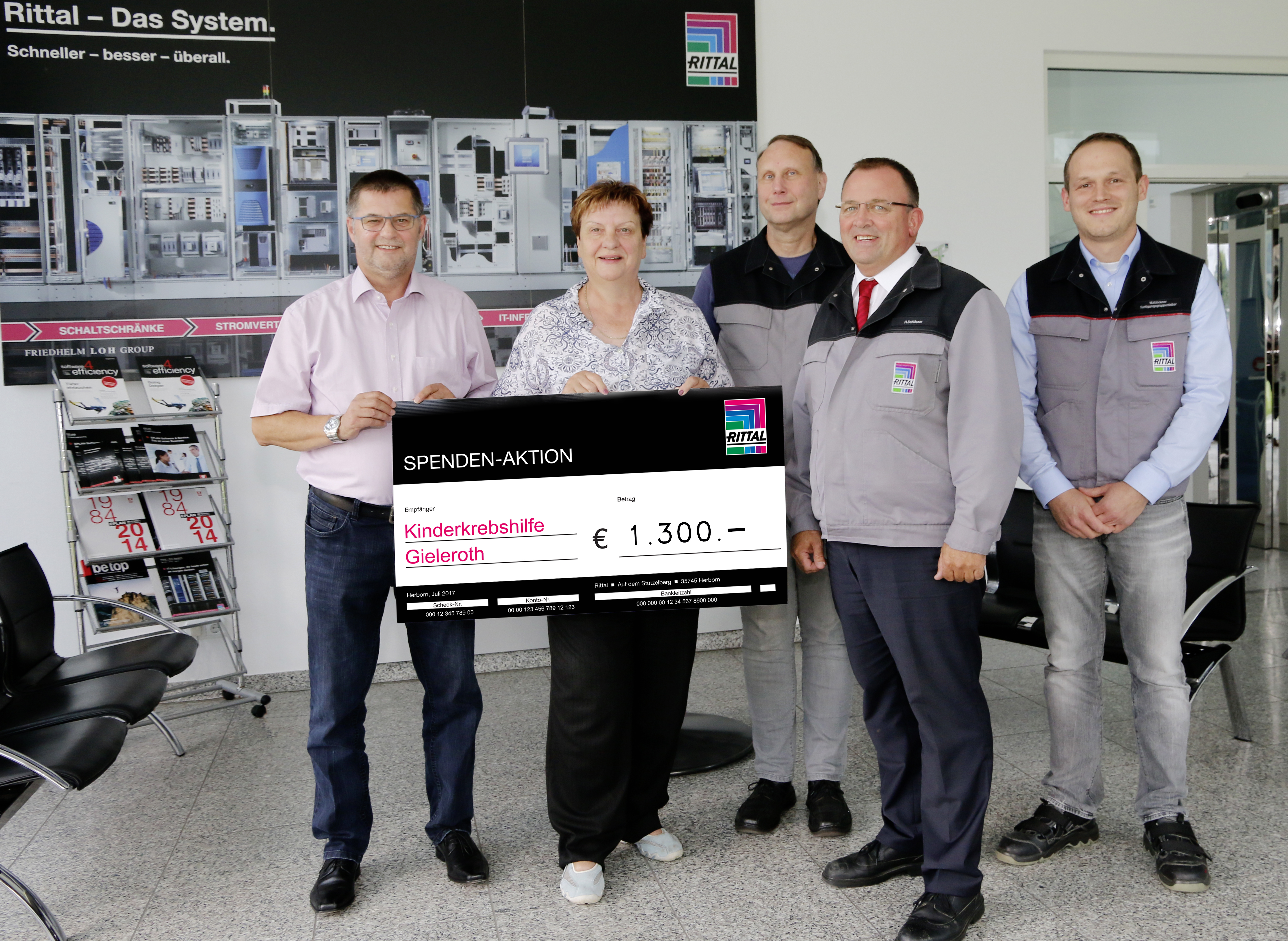 „Der Verein leistet vorbildliche Arbeit mit großem persönlichen Engagement“, so Helmut Schlösser, Werkleiter bei Rittal in Hof, der sich über die rege Teilnahme der Kollegen freut: „Mit unserer Spende möchten wir Hilfe leisten, wo sie am dringendsten gebraucht wird. Als Familienunternehmen ist es uns sehr wichtig, Verantwortung zu übernehmen und diesen Kindern und Familien zu helfen.“ Er danke den Engagierten der Kinderkrebshilfe Gieleroth, die seit vielen Jahren wertvolle Arbeit leisteten. Mit einem großen Scheck überbrachte Schlösser den Dank an Jutta Fischer, erste Vorsitzende des Vereins für krebs- und schwerstkranke Kinder e.V.: „Wir freuen uns sehr über die Unterstützung und danken allen Rittalern sehr herzlich“, so Fischer: „Wir geben unser Bestes für die Kinder. Jedes Lächeln ist für uns ein erreichtes Ziel.“