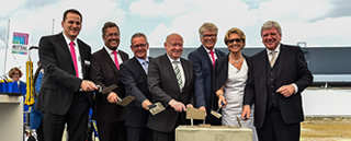 BildmaterialBild 1: Mit dem Neubau im hessischen Haiger und der Modernisierung der Werke in Rittershausen und Hof richtet der führende Schaltschrank- und Systemanbieter Rittal seine Produktion in Deutschland auf die Zukunft aus. Bei der feierlichen Grundsteinlegung des Werks In Haiger lobte Hessens Ministerpräsident Volker Bouffier die regionale Verbundenheit der Friedhelm Loh Group und ihr Bekenntnis zum Standort Deutschland. Von rechts: Hessens Ministerpräsident Volker Bouffier, Debora Loh, Dr. Friedhelm Loh, Inhaber und Vorstandsvorsitzender der Friedhelm Loh Group, Wolfgang Schuster, Landrat, Mario Schramm, Bürgermeister von Haiger, Dr. Köhler, CEO Rittal International, und Carsten Röttchen, Geschäftsbereichsleiter Produktion.
