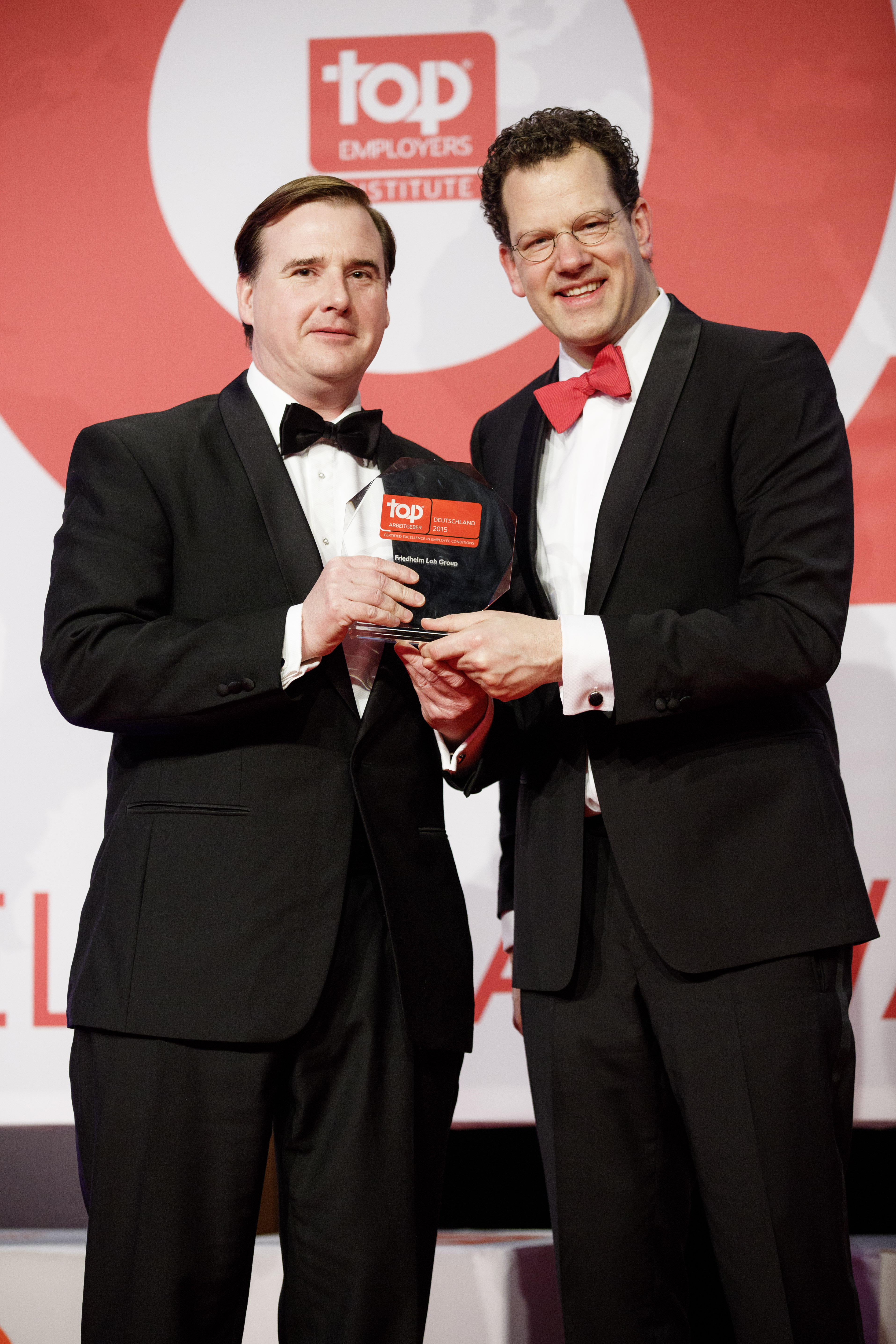 Bild 2: Bei einer feierlichen Preisverleihung überreichte David Plink (r.), CEO des Top Employers Institute, die Auszeichnung als Top Arbeitgeber 2015 an Marcus von Pock (l.), Senior Vice President Human Resources bei der Friedhelm Loh Group.