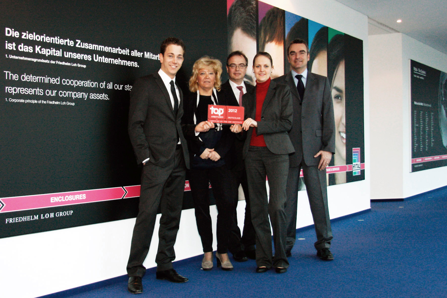 16.03.2012. Bereits zum vierten Mal in Folge ist die Friedhelm Loh Group 2012 mit dem renommierten Gütesiegel "Top Arbeitgeber Deutschland" ausgezeichnet worden. Das unabhängige CRF Institute hob bei seiner Untersuchung besonders die Arbeitsbedingungen, die Unternehmenskultur sowie die Sozialleistungen der weltweit aktiven Unternehmensgruppe hervor.