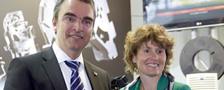 Bild 1: LKH Geschäftsführer Dr. Guido Stannek begrüßt Ministerin Eveline Lemke auf der Hannover Messe 2013.