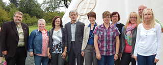 BildmaterialBild 1: Strahlen zur Einweihung des Tipis: Einige der Spender mit dem Rittal Gesamtbetriebsratsvorsitzenden Markus Betz in der Mitte und KiTa-Mitarbeiterin Kirsten Werner (rechts).