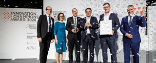 BildmaterialBild 1: Erster Platz für ONCITE: Dr. Sebastian Ritz von German Edge Cloud (Mitte) und Dieter Meuser von IoTOS (Mitte rechts) freuen sich über den Innovation Champions Award 2020. (Foto: Thorsten Jochim)
