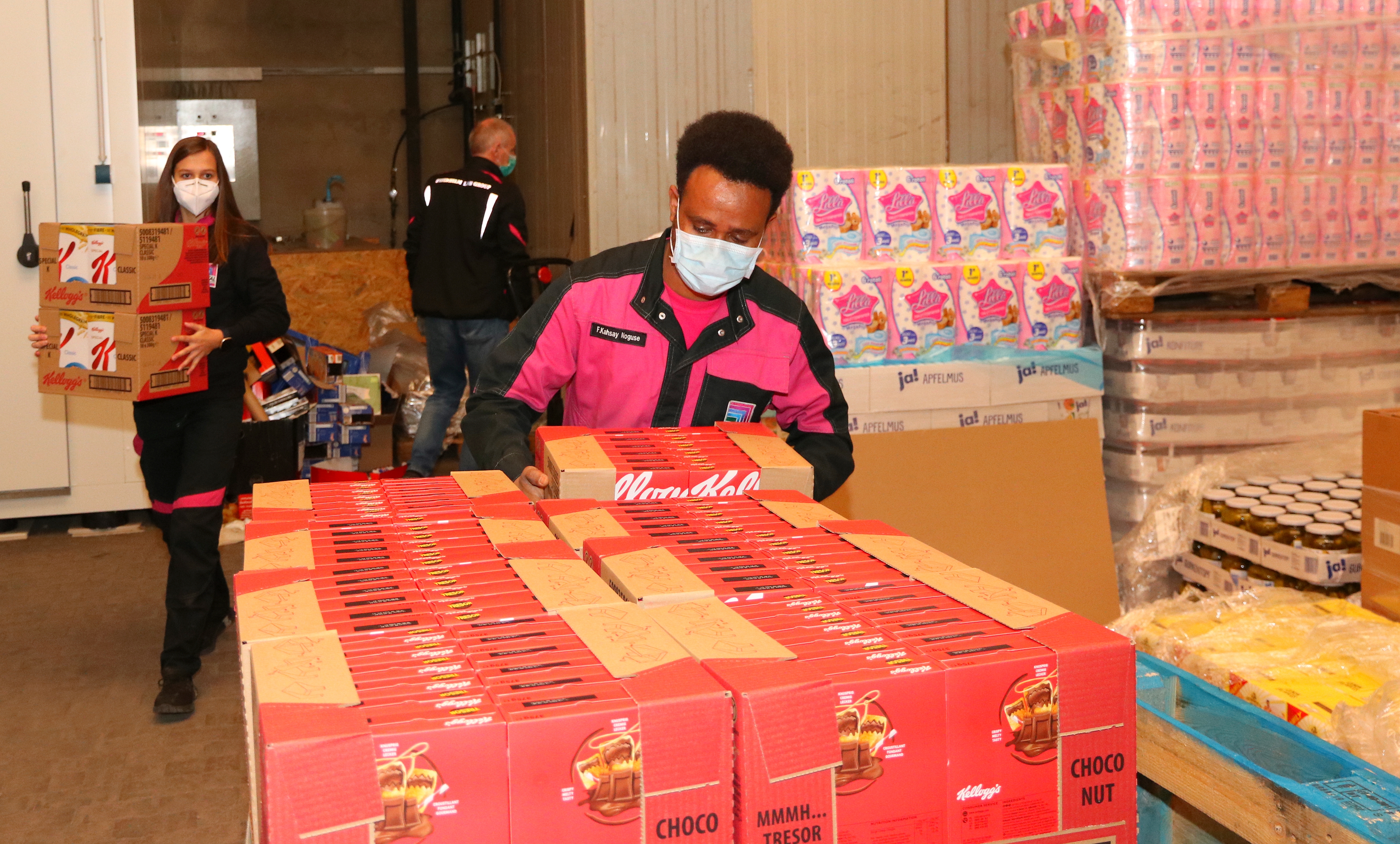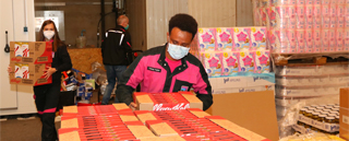 BildmaterialBild 1: Im Zentrallager der hessischen Tafeln verpackten die Auszubildenden Sachspenden gemeinsam mit Ausbildungsleiter Matthias Hecker auf Paletten.