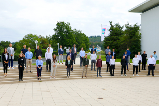 BildmaterialBild: Dr. Karl-Ulrich Köhler (hinten Mitte), Vorsitzender der Geschäftsführung bei Rittal, begrüßt die neuen Auszubildenden der Friedhelm Loh Group im Rittal Headquarter in Herborn.