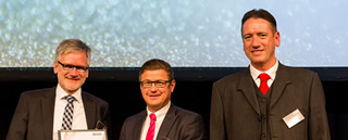 BildmaterialBild : Im Rahmen der Jubiläumsfeier in der Münchener Wappenhalle übergab Chefredakteur Wiesböck (r.) den Meilenstein der Elektronik an Rittal, vertreten durch Martin Kandziora (m.), Leiter Markt-Kommunikation, sowie Ralf Schneider (l.), Leiter Produktmanagement und Business Development Klimatisierung bei Rittal.