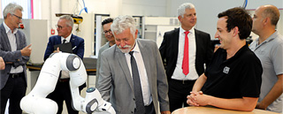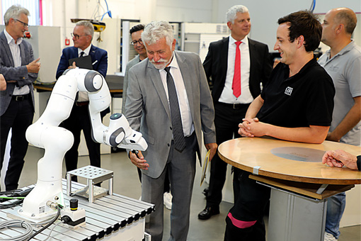 BildmaterialBild 1: Die Schüler haben einen kollaborierenden Roboter unterstützt von Ausbilder Marc Weitzel (vorne rechts) so programmiert, dass er Menschen Gegenstände reichen kann. Hier schenkt er Dieter Dembczyk vom Hessischen Kultusministerium einen Stift.