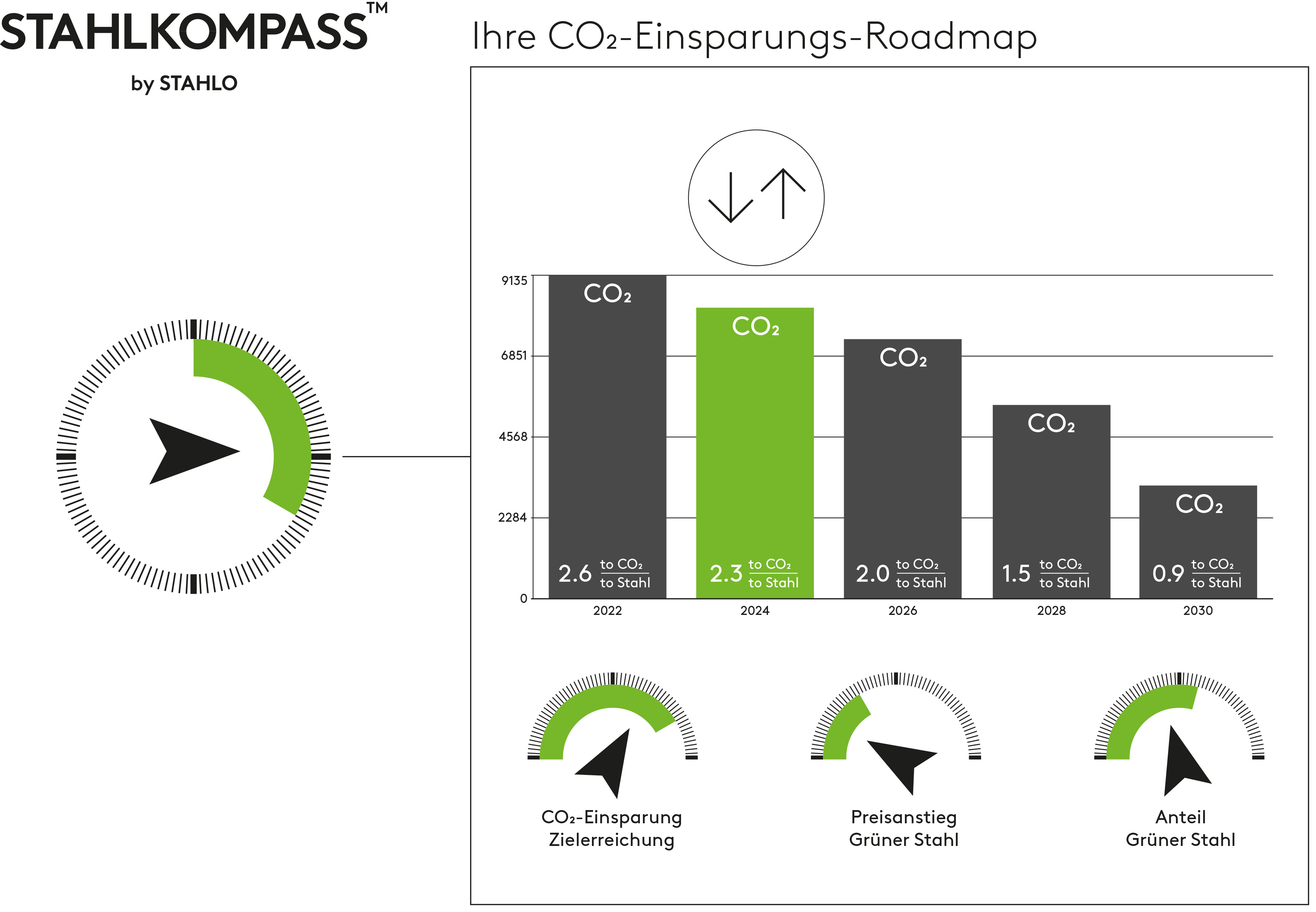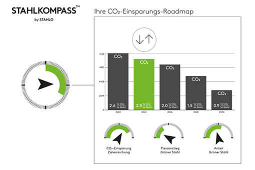 BildmaterialBild 1: Der neue Stahlkompass liefert den Kunden Scope-3 Emissionen der Lieferungen des Vorjahres und stellt dann zukünftige Optimierungsvarianten dar. Die Kunden planen mit Support von Stahlo die Emissionseinsparungen und das benötigte Budget.