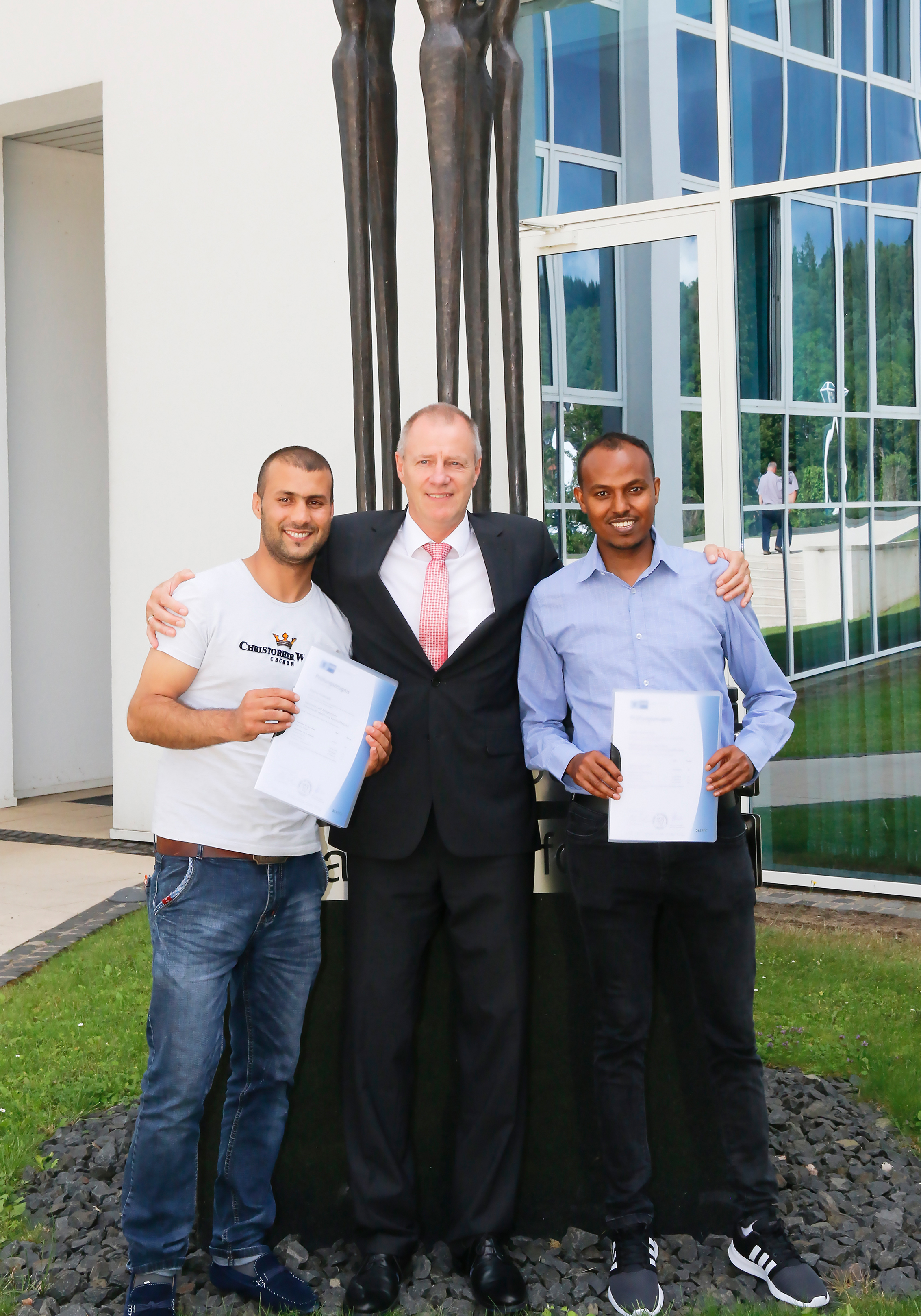 Bild 3: Khaibar Fatehzada (l.) und Eyobel Gebreyesus sind die ersten Geflüchteten, die ihre Ausbildung zum Maschinen- und Anlagenführer bei Rittal beendet haben. Ihre Prüfungen bei der IHK legten sie mit Noten über dem Kammerdurchschnitt ab. Ausbildungsleiter Matthias Hecker ist stolz: „Sie haben ihre Sache so gut gemacht, dass wir sie jetzt übernehmen.“