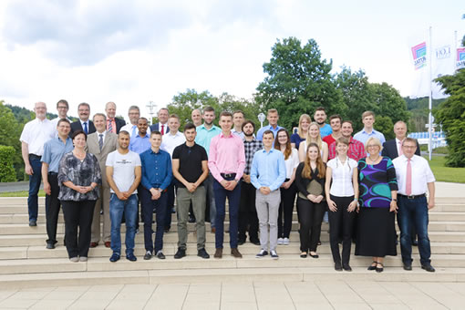 BildmaterialBild 1: 22 Azubis freuten sich mit Jörg Müller (2. Reihe, 2.v.l.), Personalleiter der Friedhelm Loh Group, Matthias Hecker (2. Reihe, r.), Ausbildungsleiter bei Rittal, und Ausbildungskoordinatorin Tina Pfeiffer-Busch (1. Reihe, 2.v.r.), über ihre Zeugnisse.