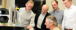 Bild 2: Schauten sich den 3D-Drucker ganz genau an (v.l.): Der Vorsitzende der Rittal Foundation Friedemann Hensgen, Rolf Benner und Matthias Kienholz von Rittal, der wissenschaftliche Mitarbeiter Stefan Dickel und Professor Dr. Hartmut Bode von der THM.