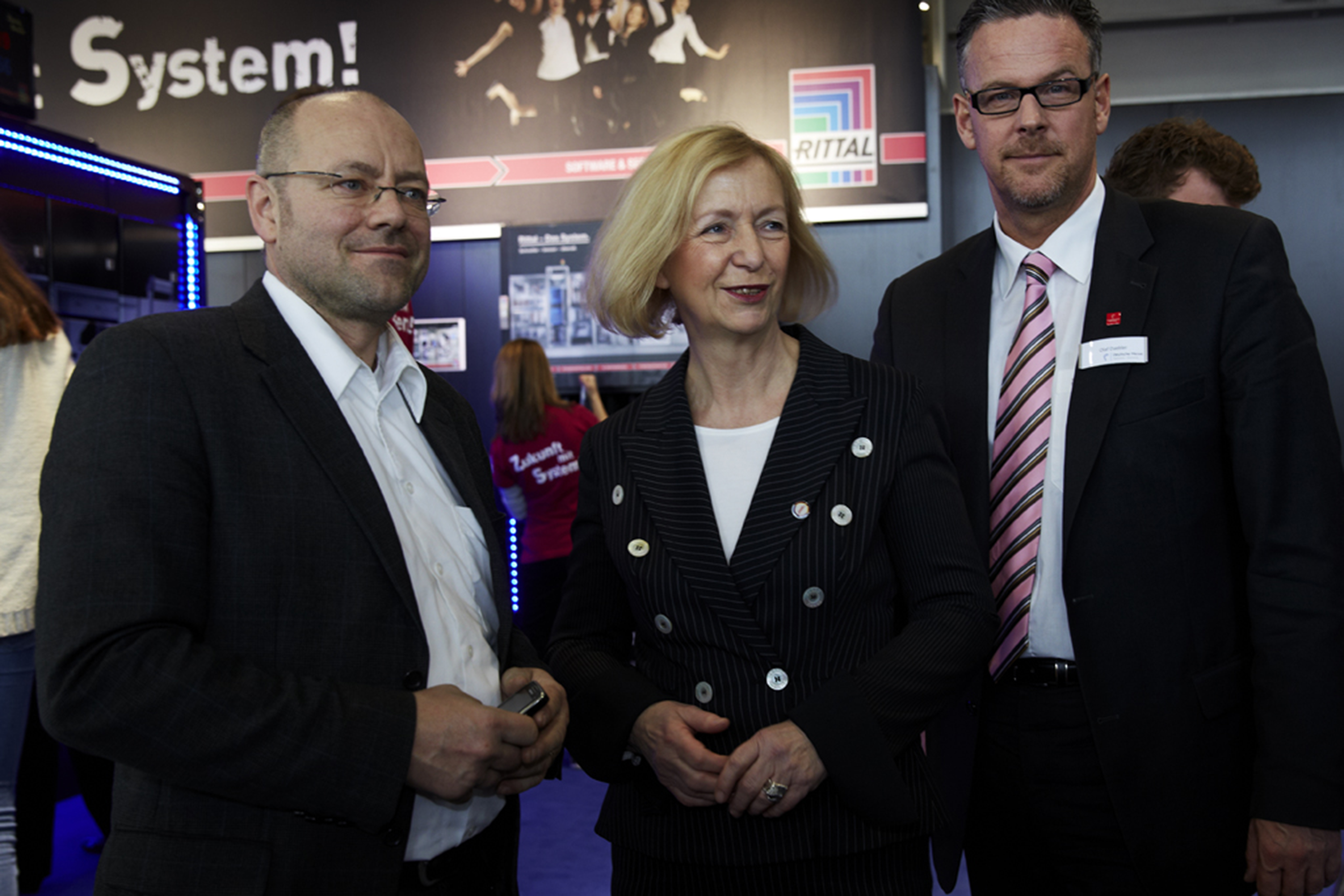 Begeisterung für Technik wecken – das ist das Ziel der TectoYou. Jedes Jahr bietet die Nachwuchsinitiative jungen Menschen im Rahmen der Hannover Messe die Gelegenheit, High Tech hautnah zu erleben und sich über technische Berufe zu informieren. Rund 600 Schülerinnen und Schüler von neun Schulen zwischen Siegen und Nidda sowie Studentinnen und Studenten der Universität Siegen und der Technischen Hochschule Mittelhessen haben an dem Programm teilgenommen. Auf Einladung von Rittal verbrachten sie einen spannenden Tag auf der größten Industrieschau der Welt. Schirmherrin der TectoYou ist die neue Bundesbildungsministerin Johanna Wanka, die sich am Rittal Stand über die Aus- und Weiterbildungsmöglichkeiten des Schaltschrank- und Systemherstellers informierte.