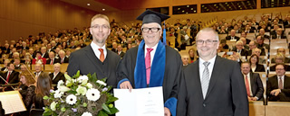 BildmaterialBild: Prof. Dr. Thomas Lampke (l.), Prodekan für Forschung, Internationales und Gleichstellung der Fakultät für Maschinenbau, und Prof. Dr. Andreas Schubert (r.), Kommissarischer Rektor der TU Chemnitz, verliehen Friedhelm Loh vor großem Auditorium feierlich die Ehrendoktorwürde.