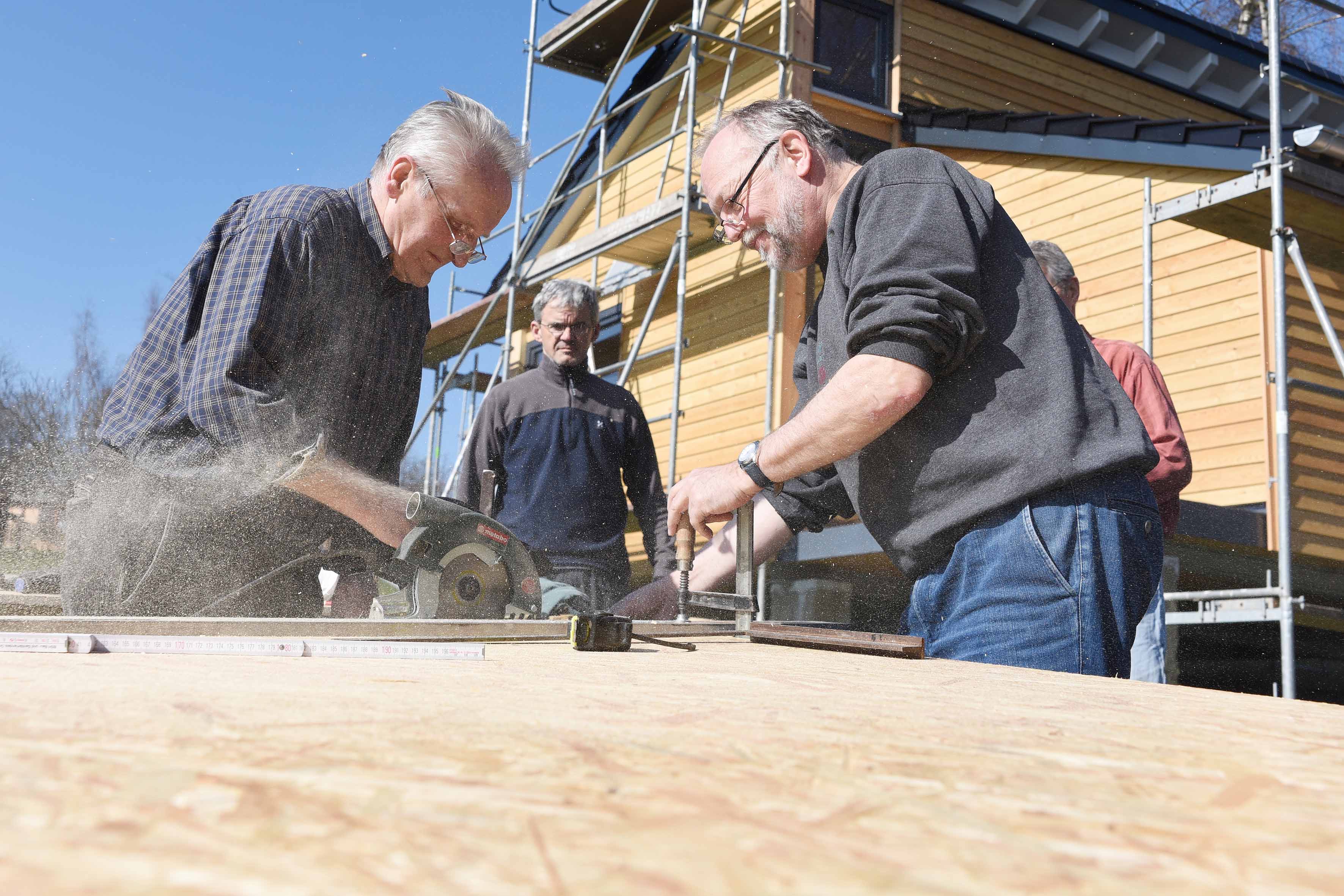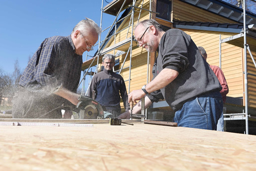 Gleich an zwei Samstagen waren sie in aller Frühe auf den Beinen, sprangen ins Auto und fuhren hochmotivert nach Siegbach-Oberndorf. Peter Dalla Villa, Jürgen Graf, Horst Besserer, Dieter Hast, Rainer Herget und Markus Betz hatten einen guten Grund für ihren Einsatz am sonnigen Wochenende – den guten Zweck nämlich, der im Jugendheim Oberndorf im dringend notwendigen und lang ersehnten Innenausbau der neuen Holzhäuser bestand. Viel zu tun für die Mannschaft aus Ehemaligen und Mitarbeitern der Friedhelm Loh Group, die mit viel Spaß und einer riesigen Portion Motivation zum Arbeitseinsatz nach Siegbach kamen. „Hier ist Anpacken gefragt und da sind wir natürlich gern dabei und helfen, wo Hilfe benötigt wird“, sagt Rainer Herget, dessen Arbeit im technischen Support bei Rittal sonst eher am Telefon stattfindet.