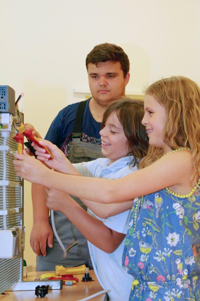 Bild 2: Mit viel Spaß üben sich die Mitarbeiterkinder Emma Deusing und Philipp Knopf auf dem Gebiet der Elektrotechnik. Ludwig Schön, Auszubildender zum Betriebselektroniker bei Rittal, zeigt ihnen in der Ferienbetreuung der Comenius Schule, wie man eine Gebäudeinstallation verkabelt.