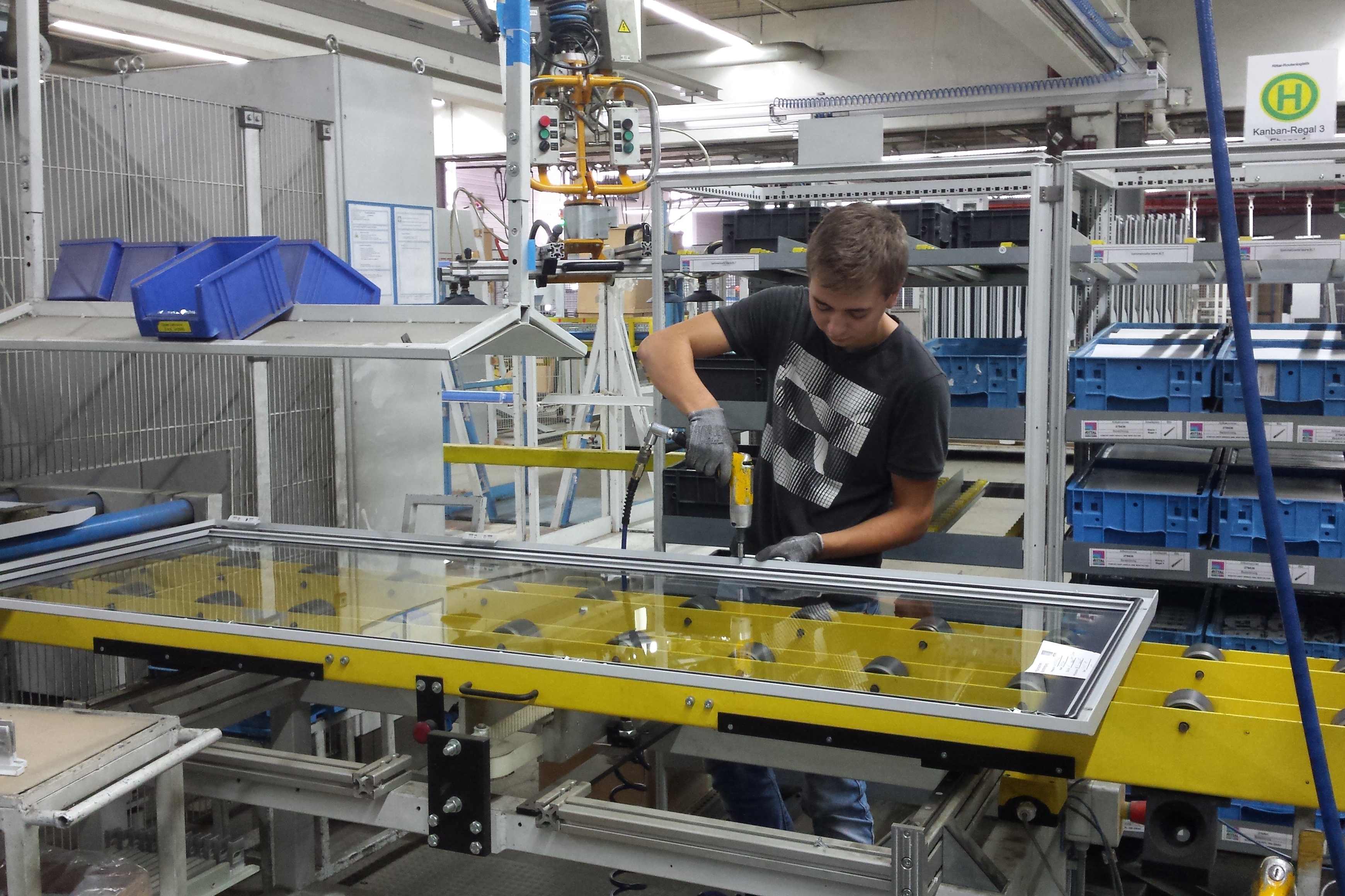 Bild 3: Nach der Startphase arbeitete der angehende Wirtschaftsingenieur Jonas Debus zwei Wochen lang in der Montage bei Rittal. Dort schraubte er Scharniere und Griffe an die Türen der Schaltschränke.