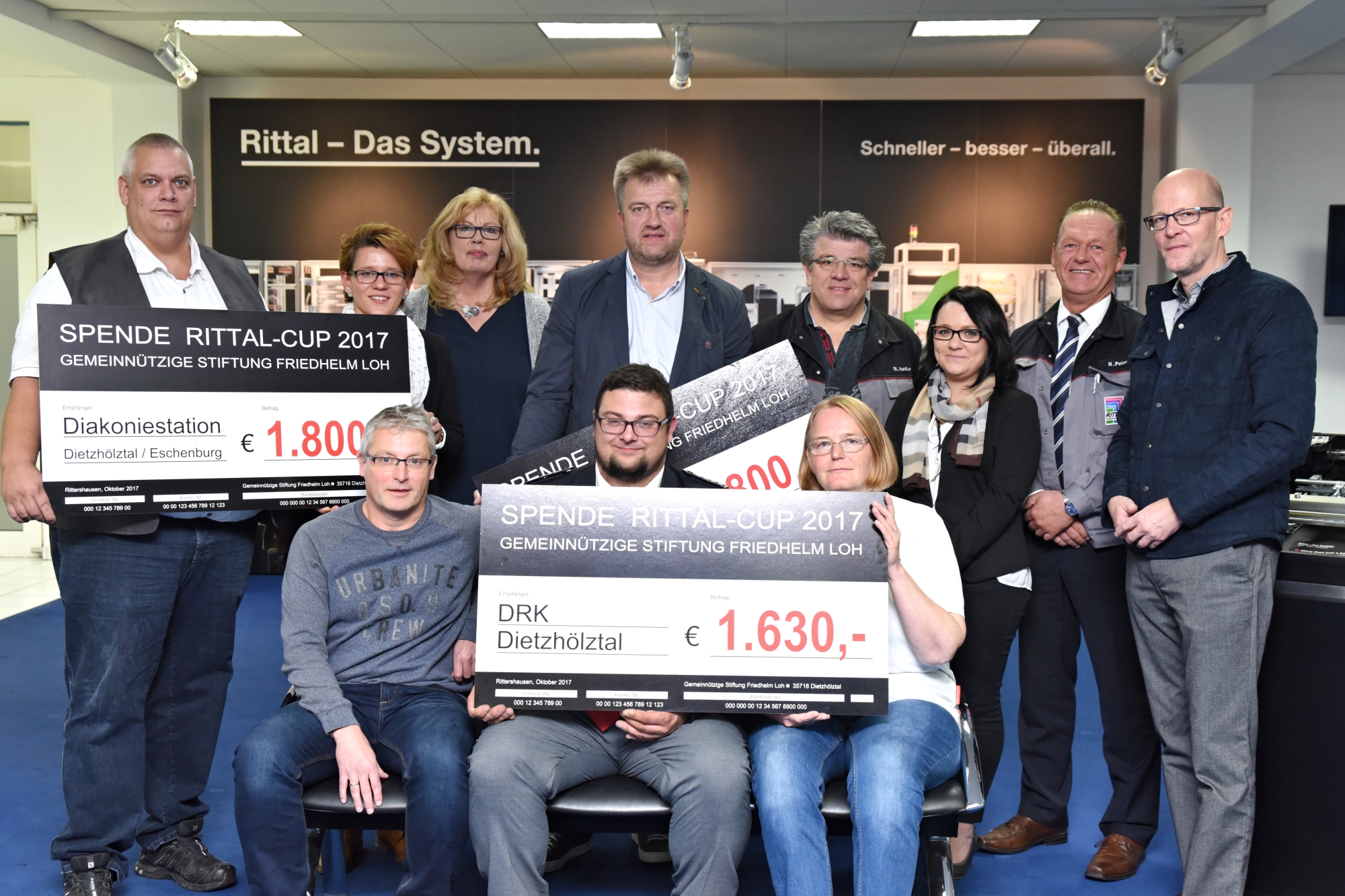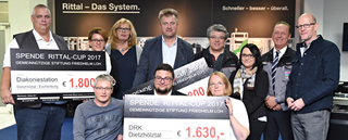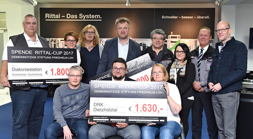 Bei Spiel und Spaß kam auch der gute Zweck nicht zu kurz: Über 4.700 Euro erspielten die Sportler bei dem Jubiläumsturnier. Nun wurde der Erlös, den Inhaber Professor Friedhelm Loh kurzerhand auf 10.000 Euro aufrundete und damit zur Rekordspende machte, offiziell an vier glückliche Empfänger aus dem Dietzhölztal übergeben. „Für Sie und für uns ist es ein toller Moment, die Spende 2017 zu überreichen“, freute sich Norbert Peter, Leiter des Rittal Werks Rittershausen. So viel Geld wie noch nie in der Geschichte des Cups habe er weitergeben können. Die DRK Dietzhölztal, die Diakoniestation Dietzhölztal/Eschenburg, die SG Dietzhölztal und der Verein „Neustart“ aus Breitscheid nahmen die Schecks in Rittershausen entgegen.