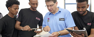 BildmaterialBild 1: Ein Tipp des Ratgebers Integration der Friedhelm Loh Group lautet: Ausbilder und Flüchtlinge müssen mit Herz bei der Sache sein. Robert Habbaba (m.), Ausbilder bei Rittal, geht zwar behutsam und mit Fingerspitzengefühl mit seinen Praktikanten um, verlangt aber auch Ehrgeiz und Engagement.