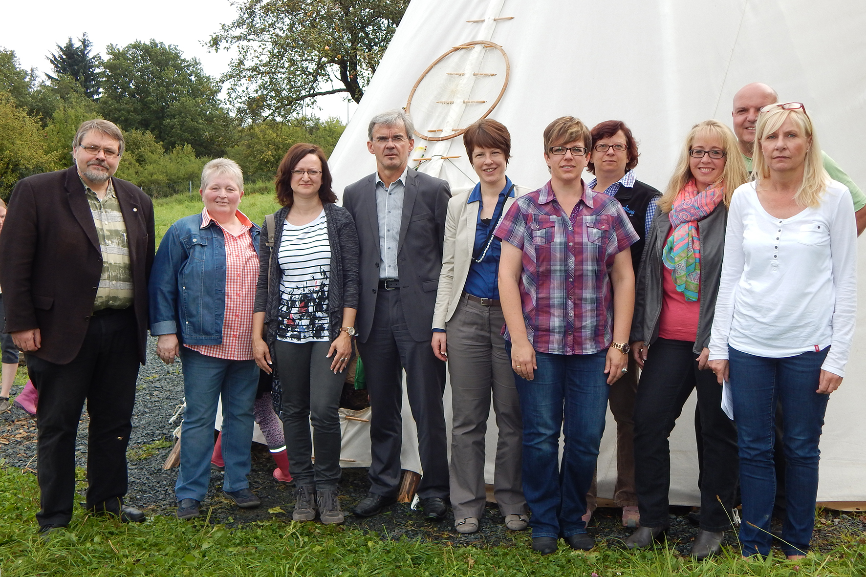 BildmaterialBild 1: Strahlen zur Einweihung des Tipis: Einige der Spender mit dem Rittal Gesamtbetriebsratsvorsitzenden Markus Betz in der Mitte und KiTa-Mitarbeiterin Kirsten Werner (rechts).