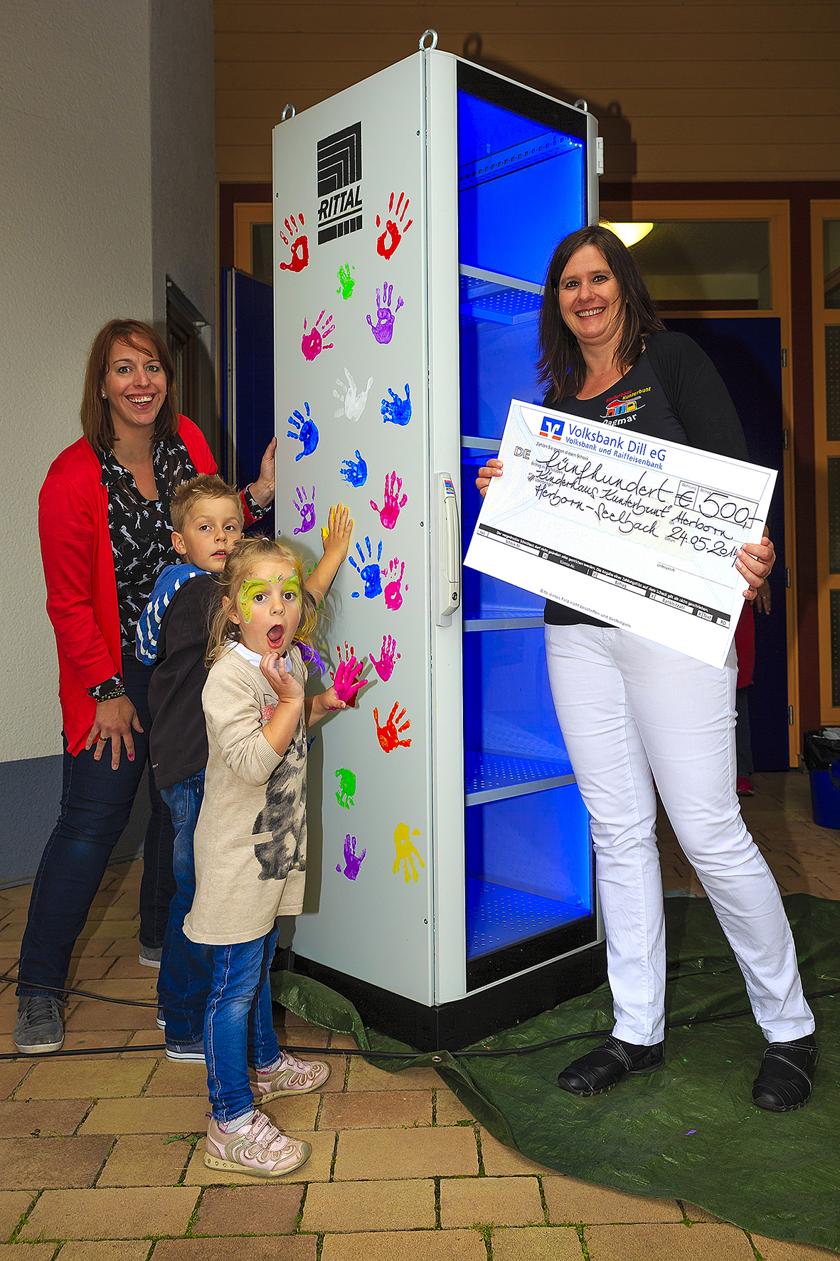 Auch die Kinder und Erzieher des Kinderhauses "Kunterbunt" in Herborn dürfen sich über eine Zuwendung der Rittal Foundation freuen. Anlässlich der Feier zum 50-jährigen Bestehen der Kindertagesstätte spendete die Stiftung einen nagelneuen TS 8 Schrank, den man sonst in großen Werkshallen findet. Ausgestattet mit Glastür und LED-Leuchten dient er nun als Forscherschrank für Unterrichtsmaterial. Mit bunten Handabdrücken an dem stabilen Metallschrank machten die Kinder umgehend klar, für wen er bestimmt ist – für die "Einsteins der Zukunft". Im Namen der Stiftung übergab Rittal Mitarbeiterin Verena Knopf darüber hinaus einen Scheck über 500 Euro, damit der Schrank auch angemessen mit Büchern und Lehrmaterial ausgestattet werden kann. Das Kinderhaus „Kunterbunt“ ist eine der ältesten Institutionen seiner Art im Lahn-Dill-Kreis und wird von der Rittal Foundation im Rahmen des bundesweiten Projektes "Haus der kleinen Forscher" unterstützt.