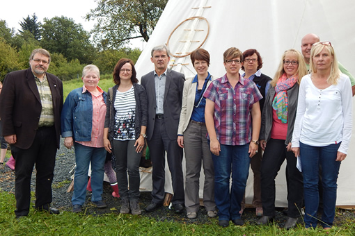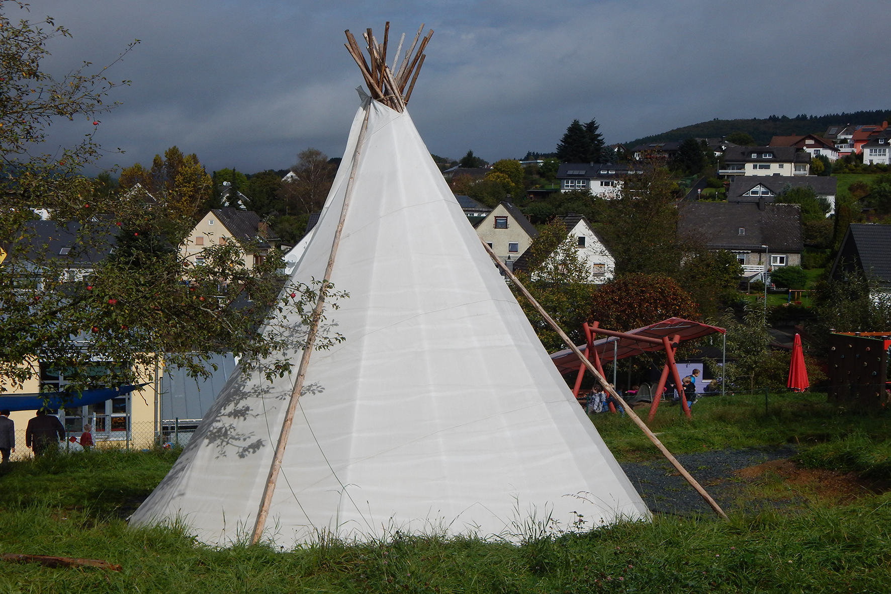 Die evangelische Kindertagesstätte "Pusteblume" im Eschenburger Ortsteil Eibelshausen konnte ihr neues, zirka vier Meter hohes Tipi einweihen. Das traditionelle Zelt der nordamerikanischen Ureinwohner musste aus Platzgründen auf der Wiese eines Nachbargrundstückes errichtet werden, mit dessen Eigentümerin eine Einigung erzielt werden konnte. Auch ihr war eine Unterstützung der Kinder wichtig. Zahlreiche Spender – Privatleute und Unternehmen der Region – hatten zum Gelingen des Projektes beigetragen. Mit 1.000 Euro beteiligte sich auch die Rittal Foundation und sorgte so dafür, dass die 90 Kinder nun mit der geräumigen Konstruktion Abenteuer erleben können. Für die Kindertagesstätte bedankte sich Erzieherin Kirsten Werner bei allen Spendern.