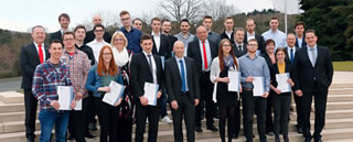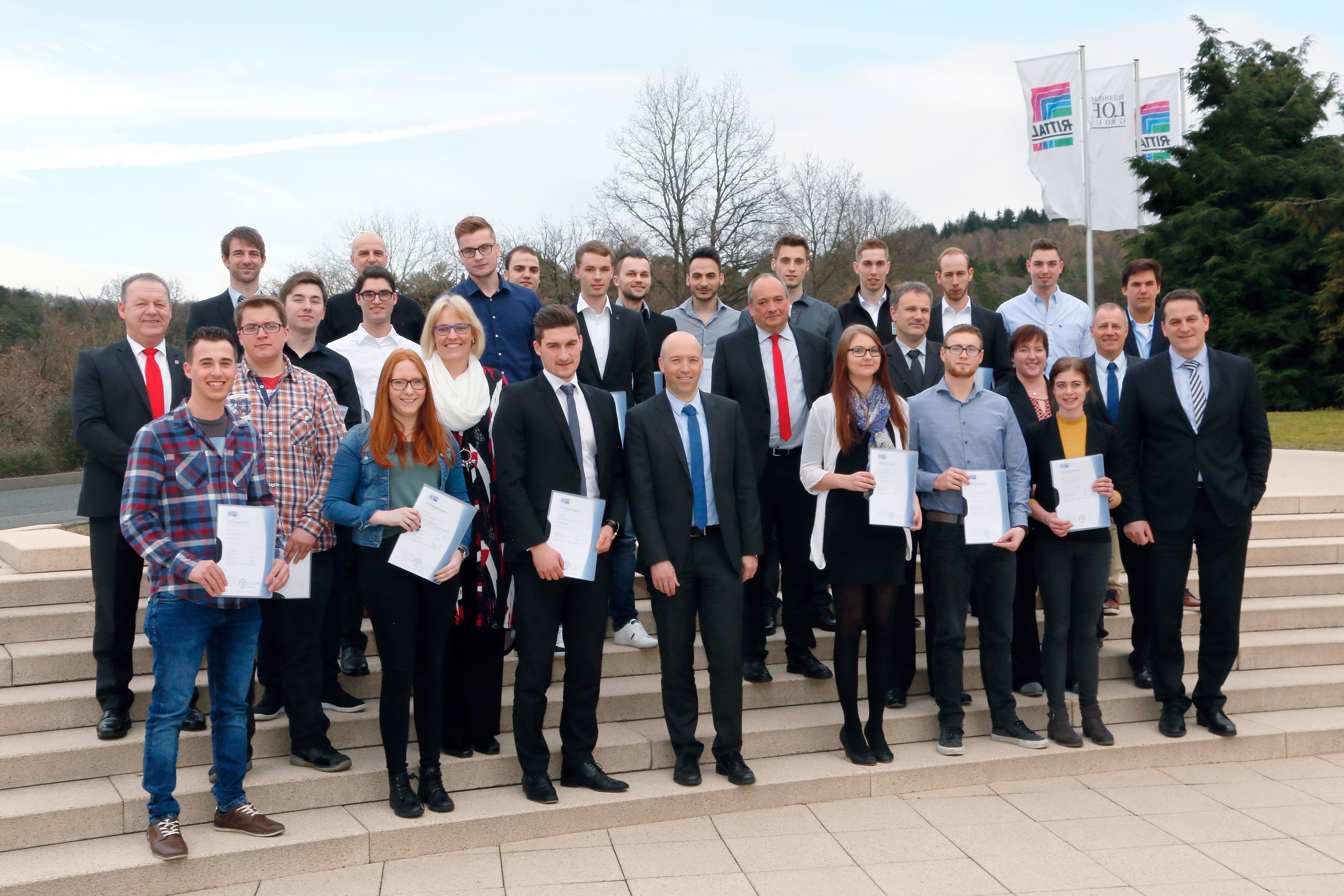 BildmaterialBild : Die Freude steht ihnen ins Gesicht geschrieben: 26 Azubis haben erfolgreich ihre Ausbildung bei Rittal und Loh Services abgeschlossen. Verabschiedet wurden sie von Carsten Röttchen (r.), Geschäftsführer Produktion, sowie vom Ausbildungsteam, Werkleitern und Personalverantwortlichen.