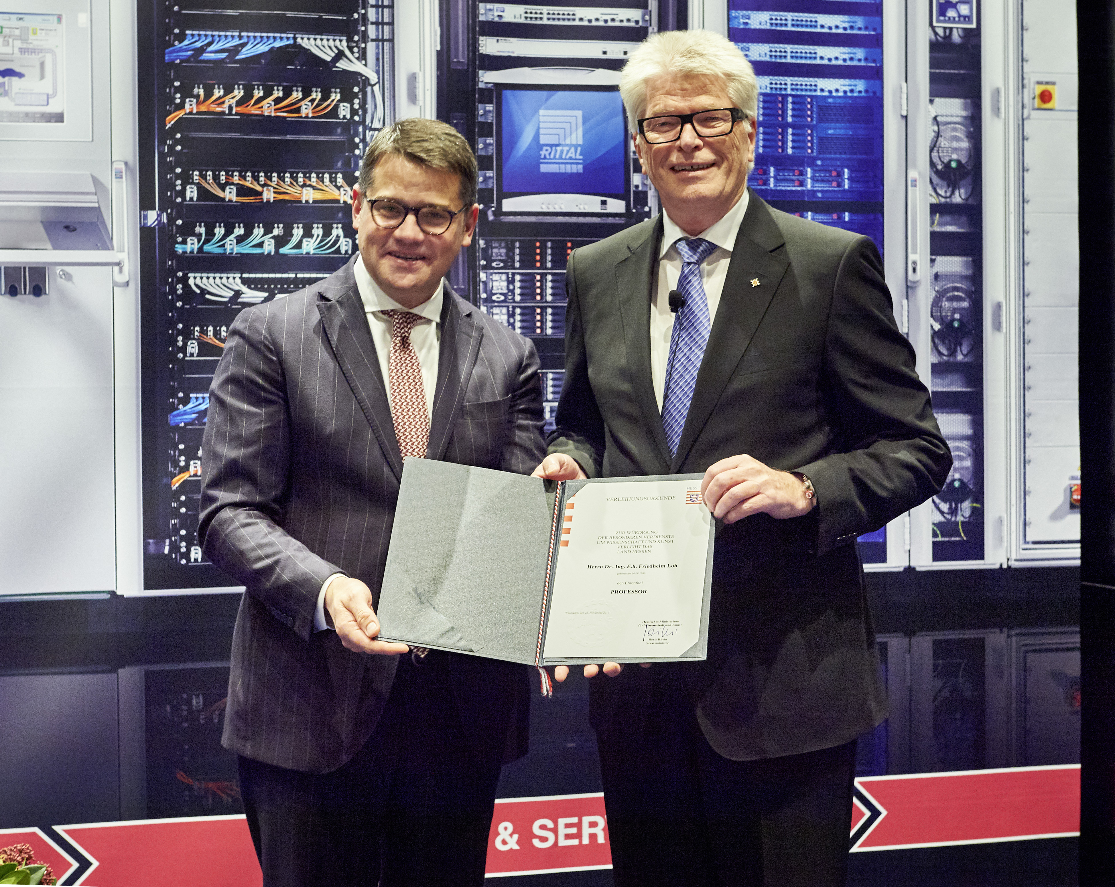 BildmaterialBild 1: Ein erfolgreiches Familienunternehmen, die Förderung von Forschung und Lehre, soziales und christliches Engagement – Unternehmer Dr. Friedhelm Loh schafft Werte in Wirtschaft und Wissenschaft. Stellvertretend für das Land Hessen würdigte Boris Rhein (l.), hessischer Minister für Wissenschaft und Kunst, jetzt das Engagement des Familienunternehmers Dr. Friedhelm Loh mit dem Titel des Ehrenprofessors.