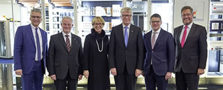 Bild 2: In seiner Laudatio betonte Professor Hans-Jörg Bullinger, Mitglied des Beirats der Friedhelm Loh Stiftung und ehemaliger Präsident der Fraunhofer-Gesellschaft, die werteorientierte Unternehmensführung Dr. Friedhelm Lohs: „Wertschöpfung durch Wertschätzung“. Von links: Prof. Dr. Stephan Holthaus, Rektor der Freien Theologischen Hochschule Gießen; Prof. Hans-Jörg Bullinger, Debora Loh, Dr. Friedhelm Loh, Boris Rhein, hessischer Minister für Wissenschaft und Kunst; Dr. Karl-Ulrich Köhler, CEO und Vorsitzender der Geschäftsführung von Rittal.