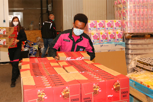 BildmaterialBild 1: Im Zentrallager der hessischen Tafeln verpackten die Auszubildenden Sachspenden gemeinsam mit Ausbildungsleiter Matthias Hecker auf Paletten.