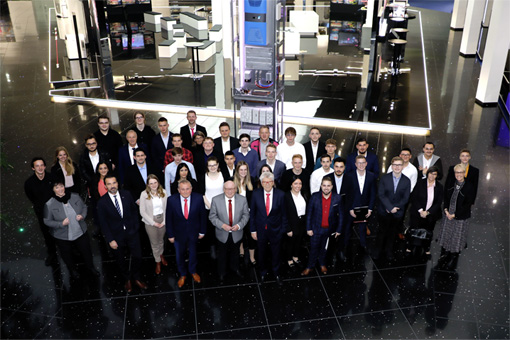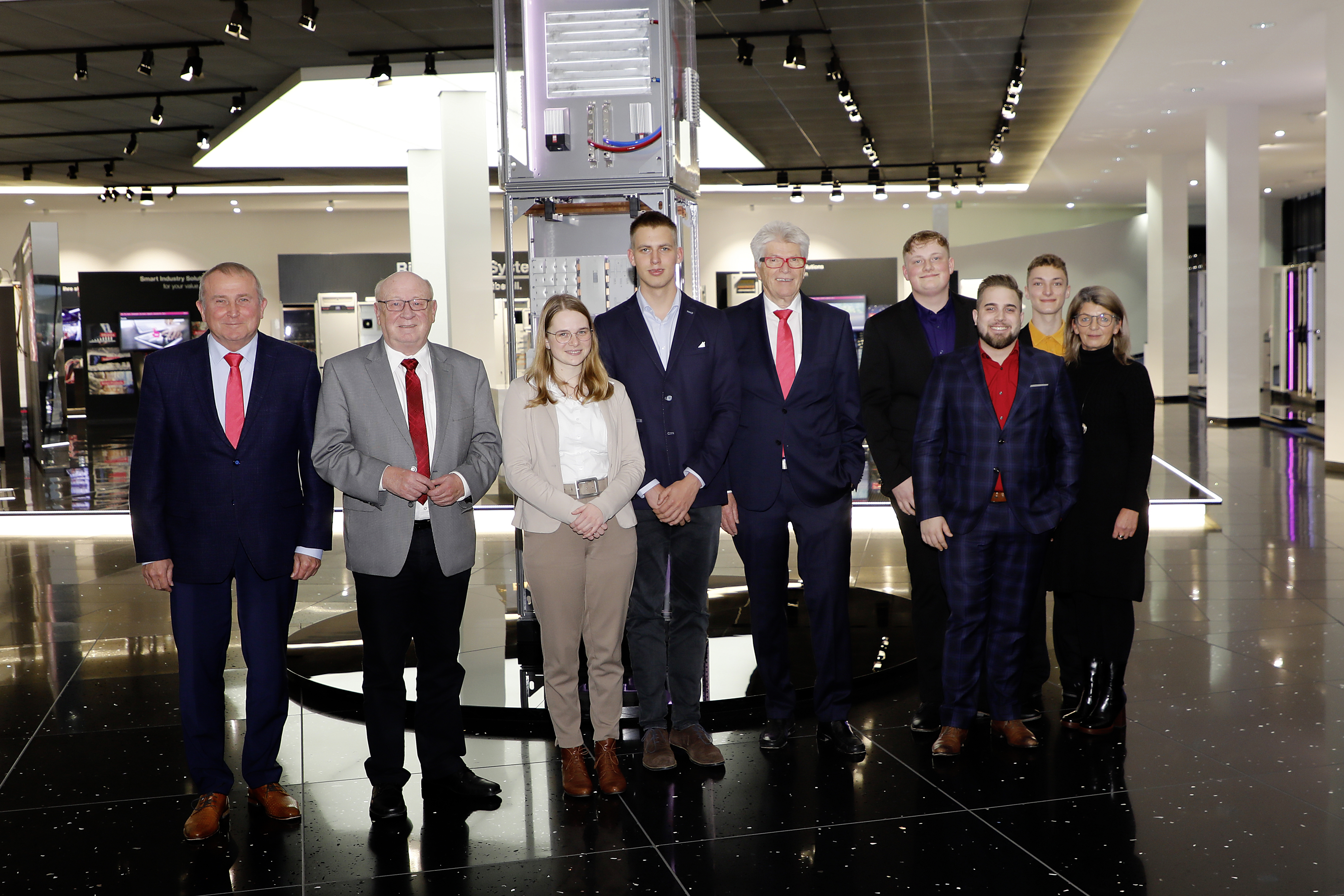 Bild 2: Prof. Friedhelm Loh (5. v.l.), Wolfgang Schuster, Landrat des Lahn-Dill-Kreises und Sergiy Lakhno, Managing Director Rittal Ukraine freuen sich mit den Gewinnern: Anna Verena Muntean (3.v.l.), Jannis Heimansfeld (4.v.l.), Paul Lenz (6. v.l.), Dean Bacic (7. v.l.) und Lio Marcel Jung.