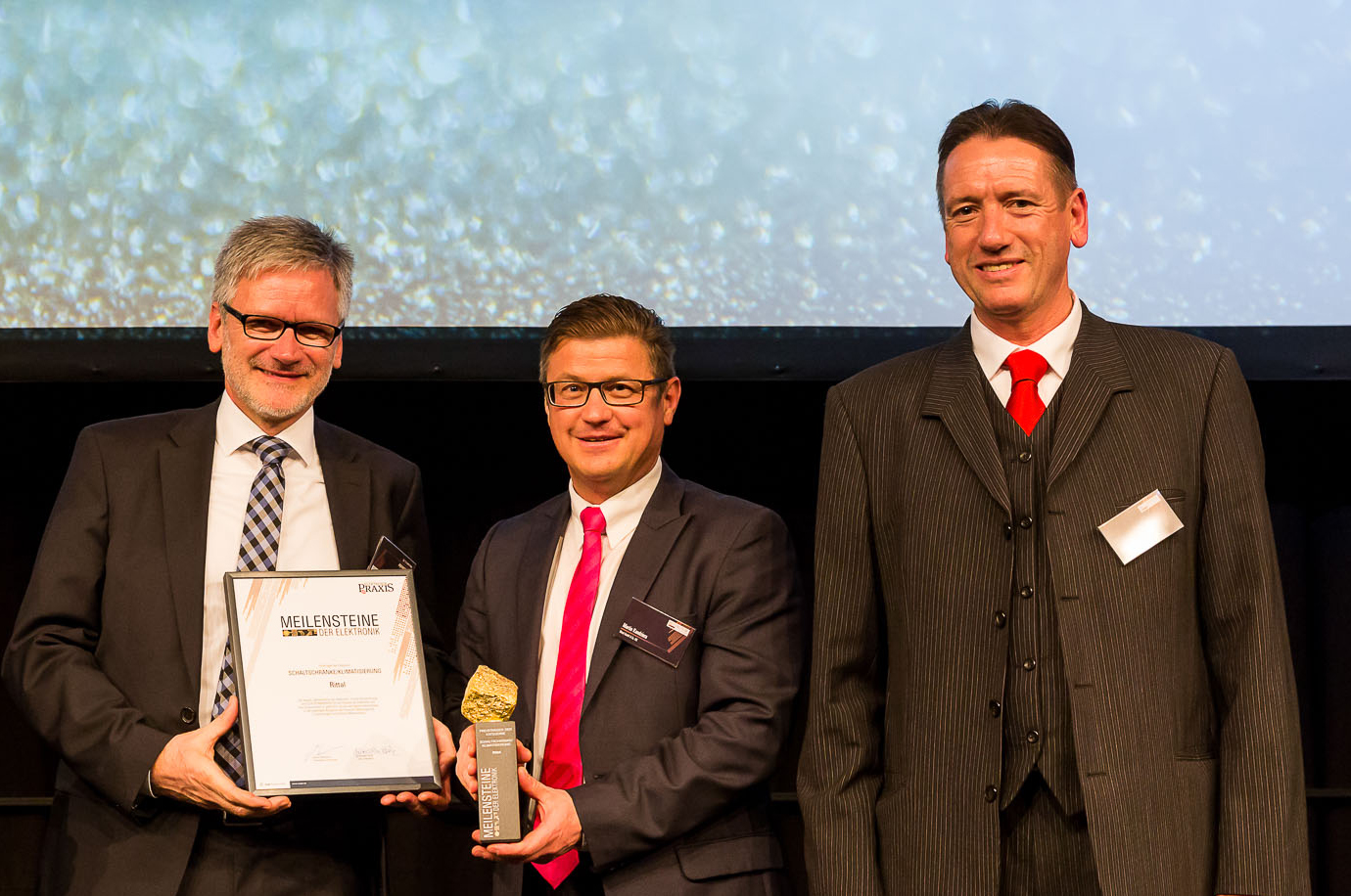 BildmaterialBild : Im Rahmen der Jubiläumsfeier in der Münchener Wappenhalle übergab Chefredakteur Wiesböck (r.) den Meilenstein der Elektronik an Rittal, vertreten durch Martin Kandziora (m.), Leiter Markt-Kommunikation, sowie Ralf Schneider (l.), Leiter Produktmanagement und Business Development Klimatisierung bei Rittal.