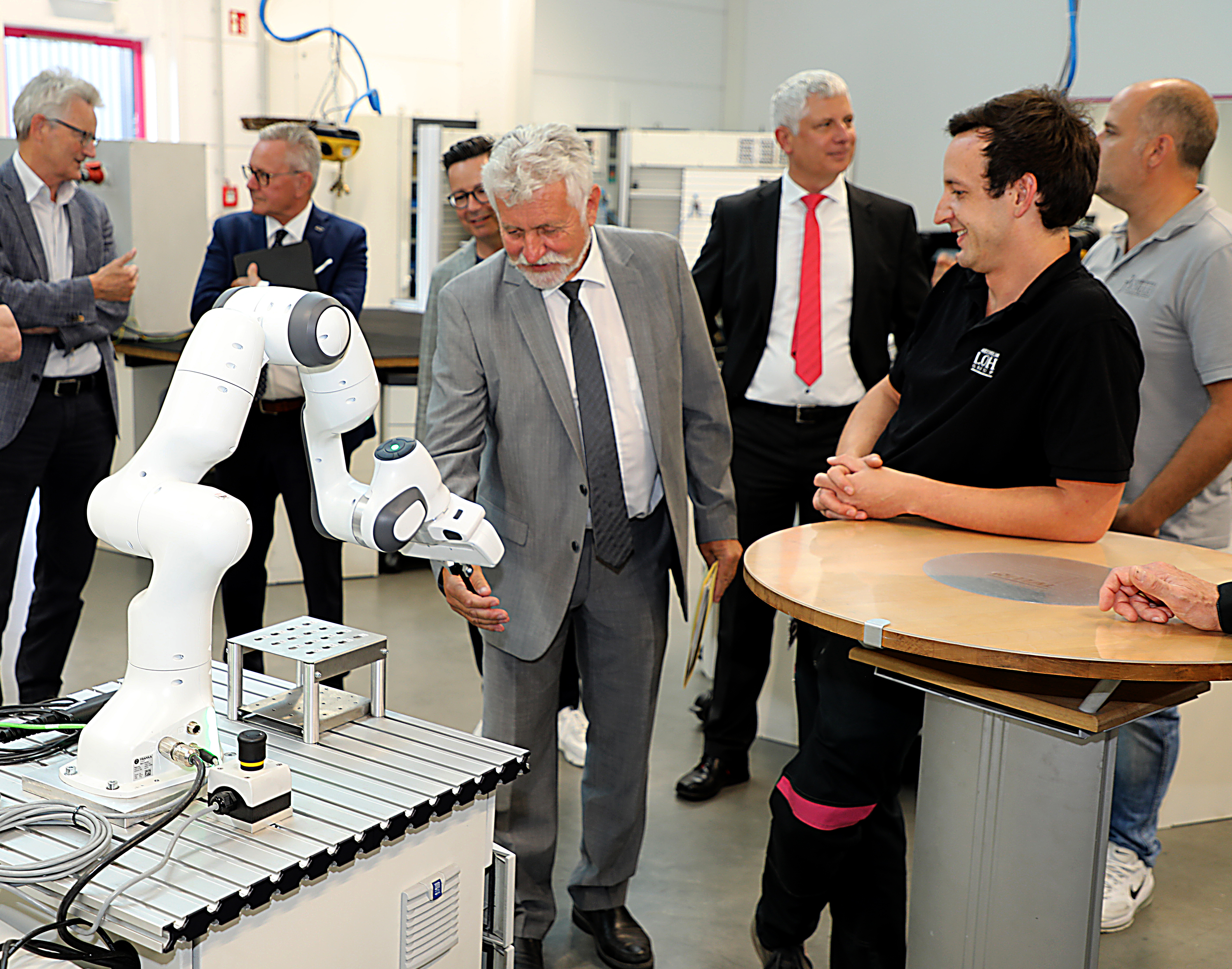 BildmaterialBild 1: Die Schüler haben einen kollaborierenden Roboter unterstützt von Ausbilder Marc Weitzel (vorne rechts) so programmiert, dass er Menschen Gegenstände reichen kann. Hier schenkt er Dieter Dembczyk vom Hessischen Kultusministerium einen Stift.