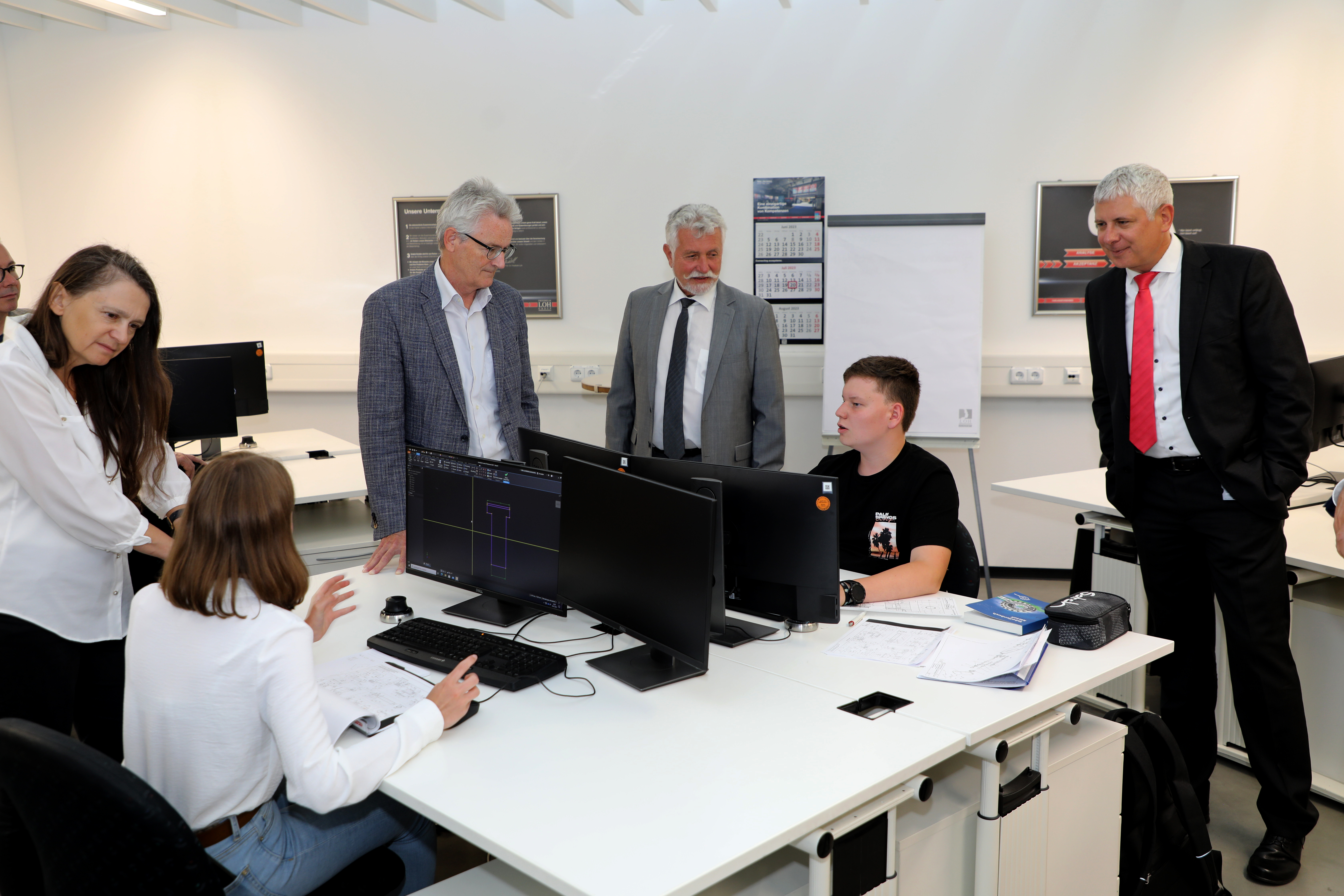 Herborn, 01. August 2023 – Stolz zeigen Noah und Anna von der Johann-Textor-Schule Haiger der Besuchergruppe ihr „Werk“: Im Schulungsraum der Technischen Produktdesigner in der Ausbildungswerkstatt der Friedhelm Loh Group in Haiger haben sie mithilfe von CAD-Software 3D-Zeichnungen von Bauteilen selbst erstellt. Die Besucher um Dieter Dembczyk, zuständig für die berufliche Orientierung beim Hessischen Kultusministerium, Prof. Harald Danne, Wirtschaftsdezernent des Lahn-Dill-Kreises, und Haigers Bürgermeister Mario Schramm staunten nicht schlecht und stellten den jungen Tüftlern interessierte Fragen.